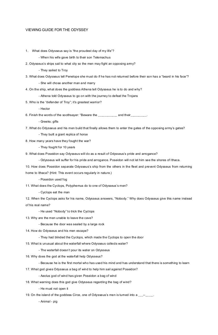 Who wrote the epic poem, The Odyssey? Name: Viewing Guide for Movie- The Odyssey Viewing Guide for Movie- The Odyssey Answer the following questions as you watch the movie. What was the name of Odysseuss wife?